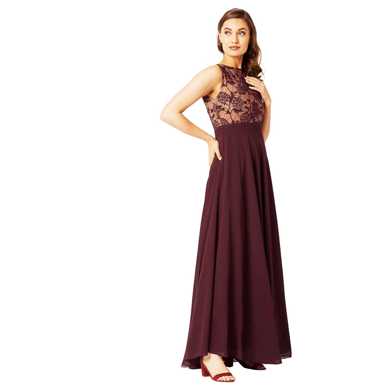 Miss Chase Women's Lavender Round Neck Sleeveless Solid Lace Overlaid Maxi Dress