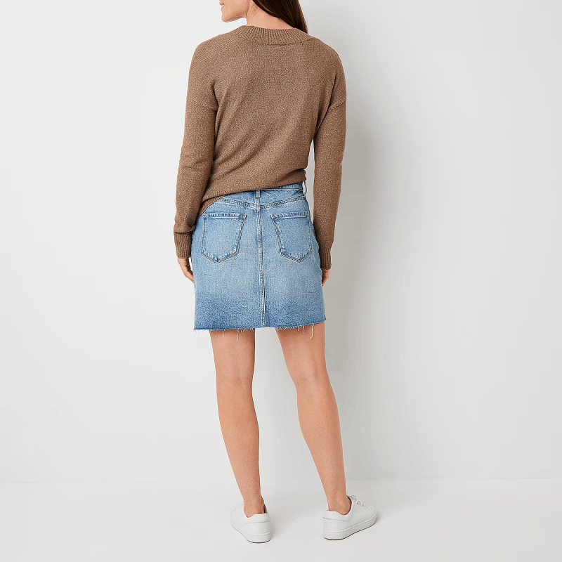women's high-rise denim mini skirt with a bit of stretch so you can move throughout your day in comfort and features a classic button-zip fly, belt loops, 5-pocket tailoring, and distressed details for an on-trend appeal.